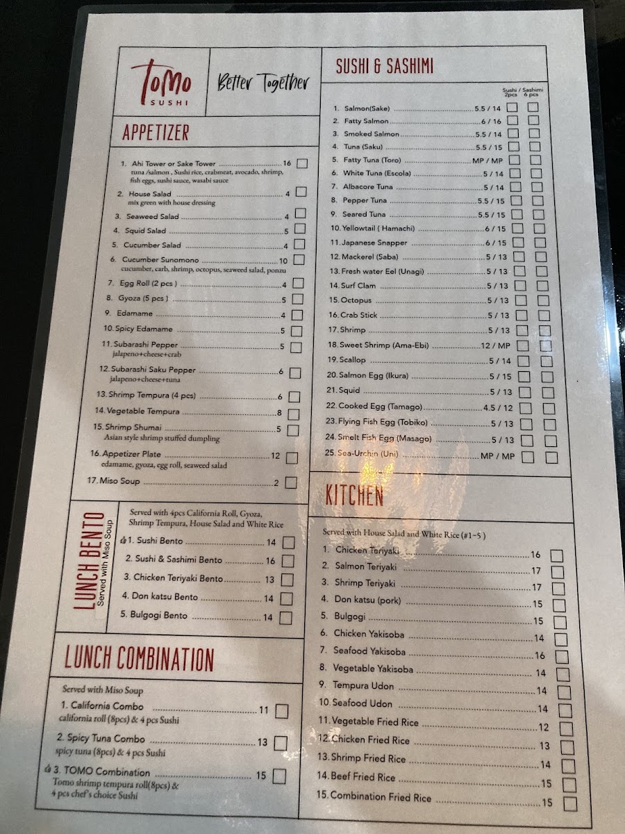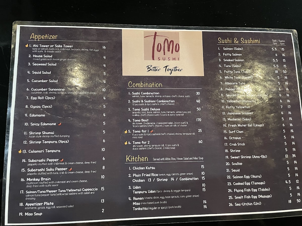 Welcome to Tomo Sushi, a delightful gem nestled in Flower Mound, Texas. Known for its exceptional sushi offerings, Tomo Sushi prides itself on freshness and quality. The menu is a culinary journey, featuring a variety of lunch bento boxes such as the Sushi Bento and Sashimi Bento, each served with California rolls, gyoza, shrimp tempura, house salad, and miso soup. For sushi enthusiasts, options like Salmon Sushi and the unique Tomo Roll elevate the dining experience.